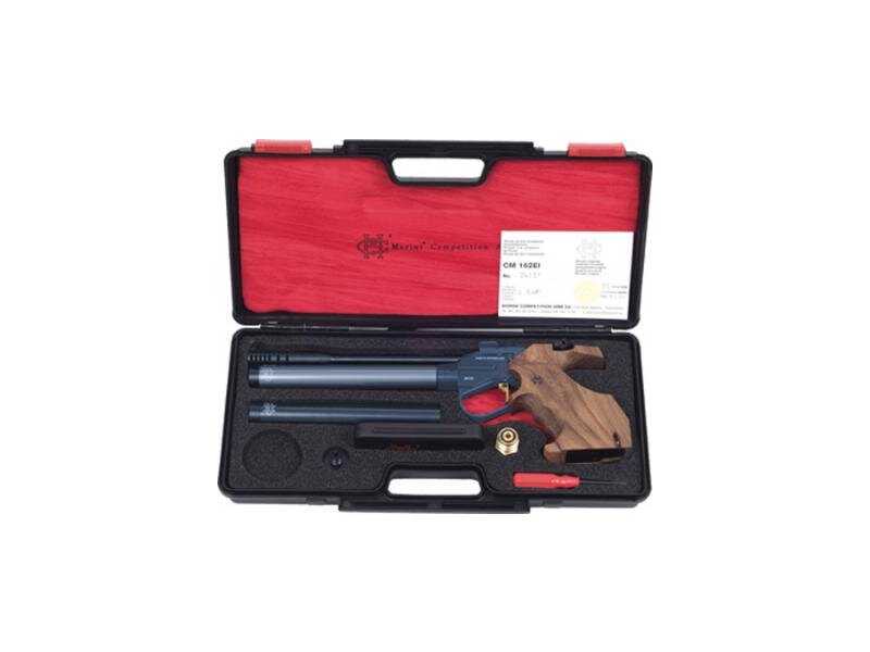 - in a rigid padded case profiled for pistol and the factory supplied accessories with provision for match pellets and a scoring gauge